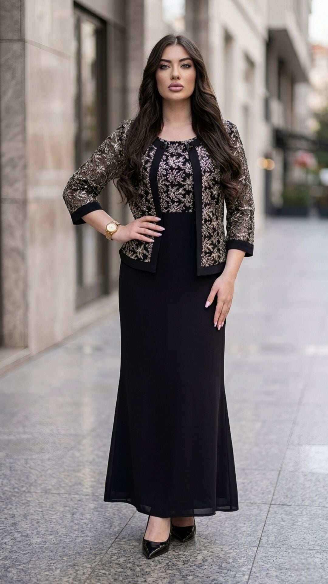 - Elbiseli Takım Tasarımı: Ceket ve elbise uyumu ile bütünlüklü, dengeli ve estetik bir kombin oluşturur.