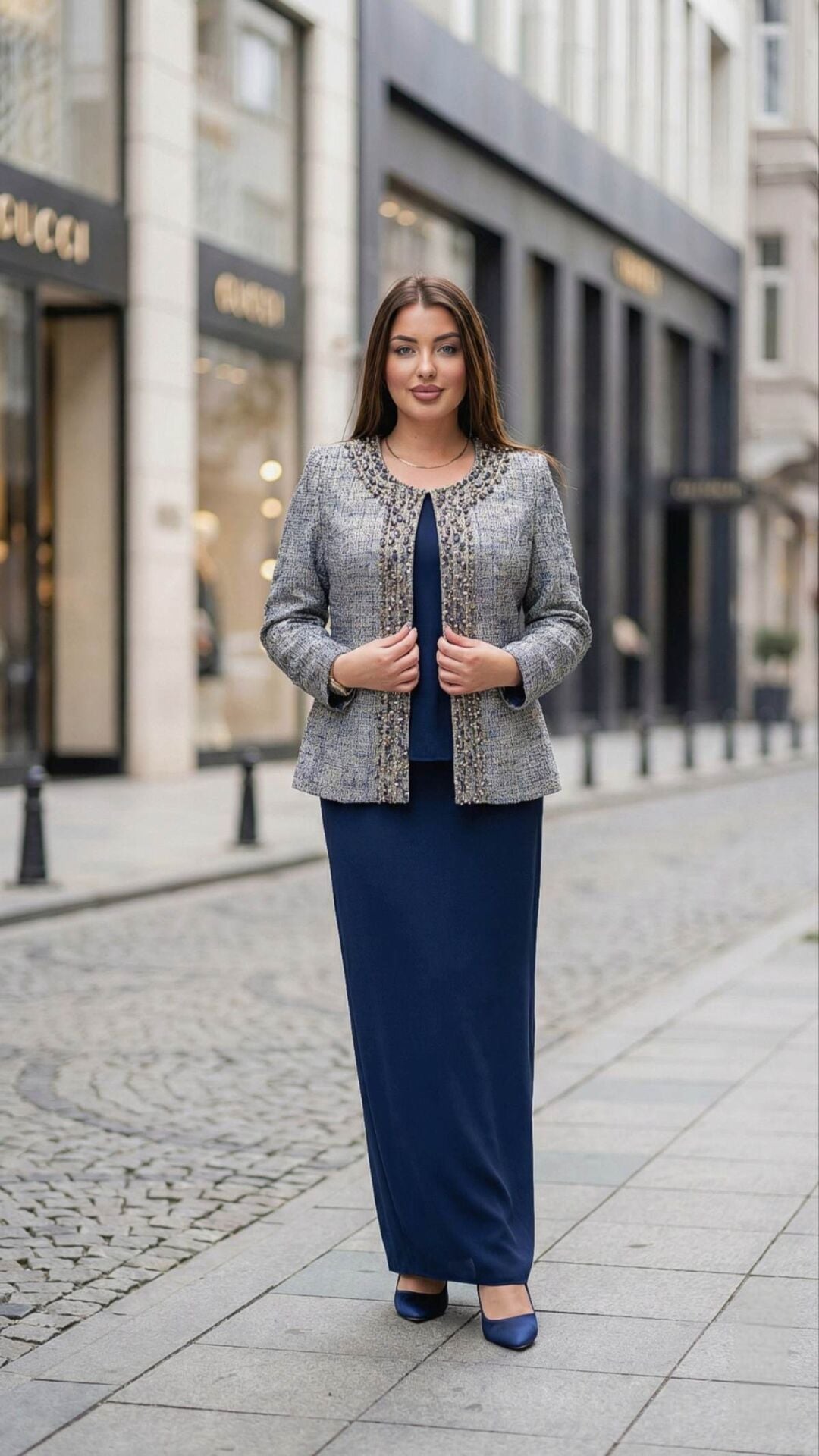 - Uyumlu Etek Tasarımı: Takım olarak tasarlanan etek, ceket ile kusursuz bir uyum sağlayarak dengeli ve şık bir siluet oluşturur.