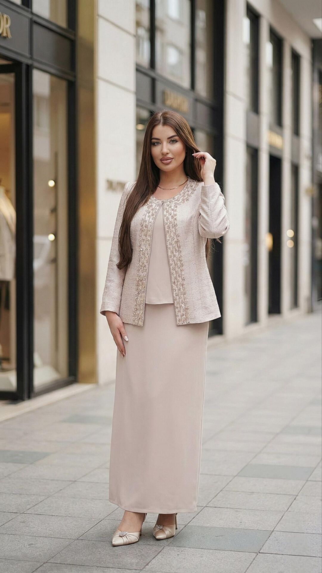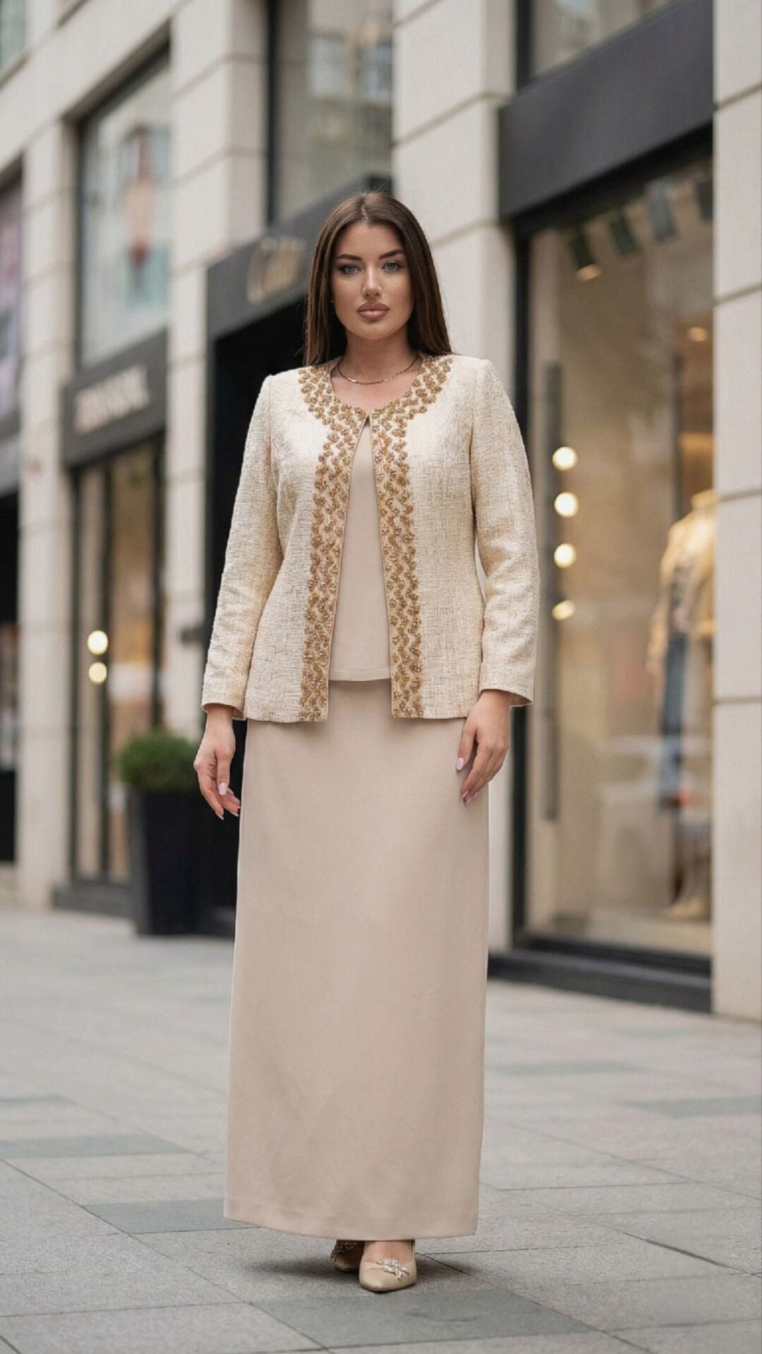 - Zarif Boncuk İşlemeleri: Ceket üzerindeki ince boncuk detayları tasarıma ışıltı ve feminen bir dokunuş kazandırır.
