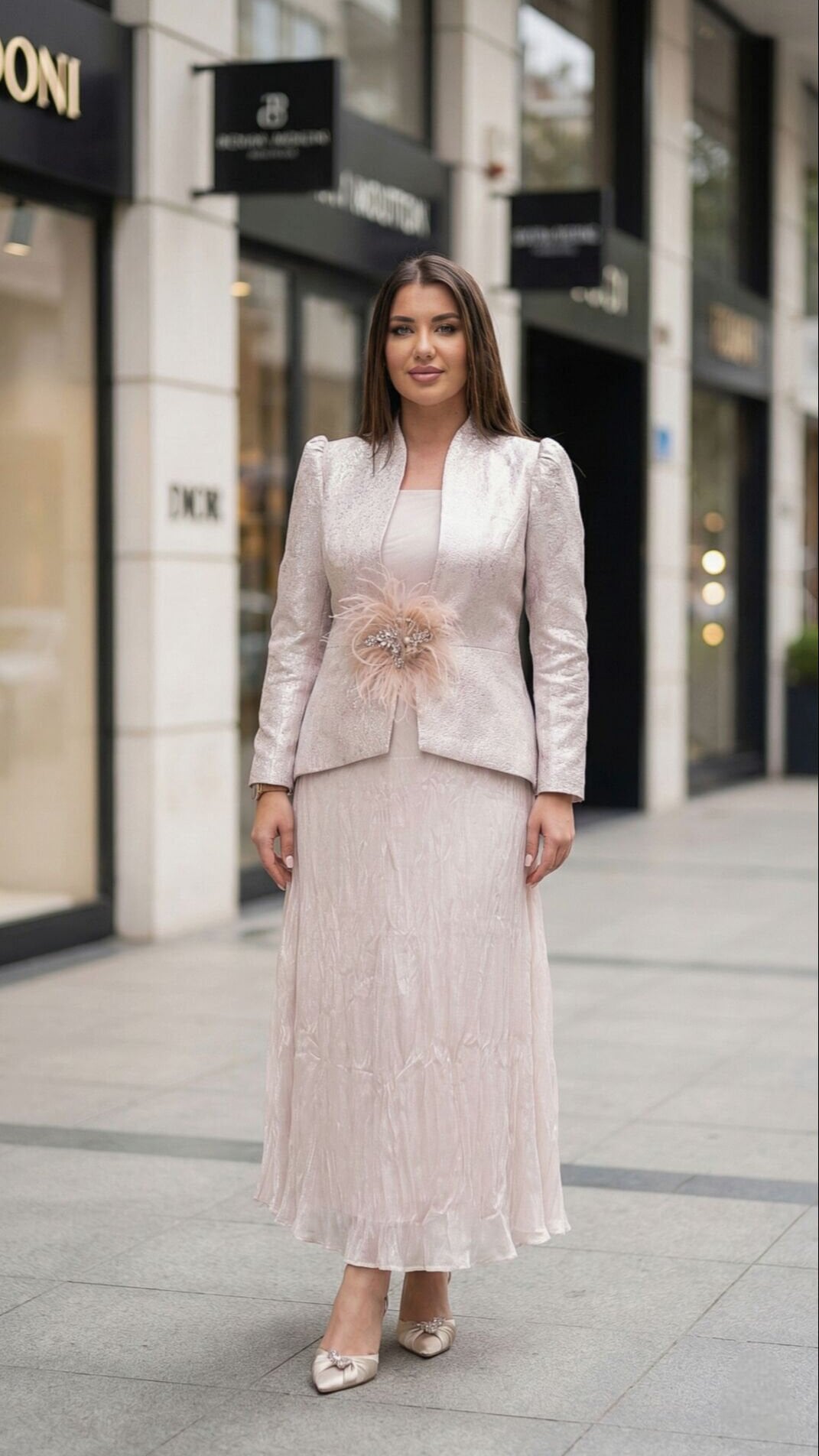 - Jakar Kumaş & Broş Detayı: Şık jakar dokulu ceket ve zarif broş ile modern bir stil.