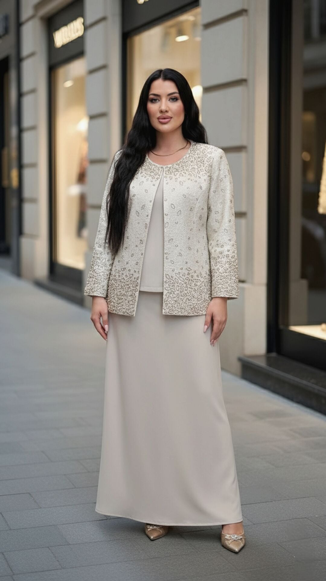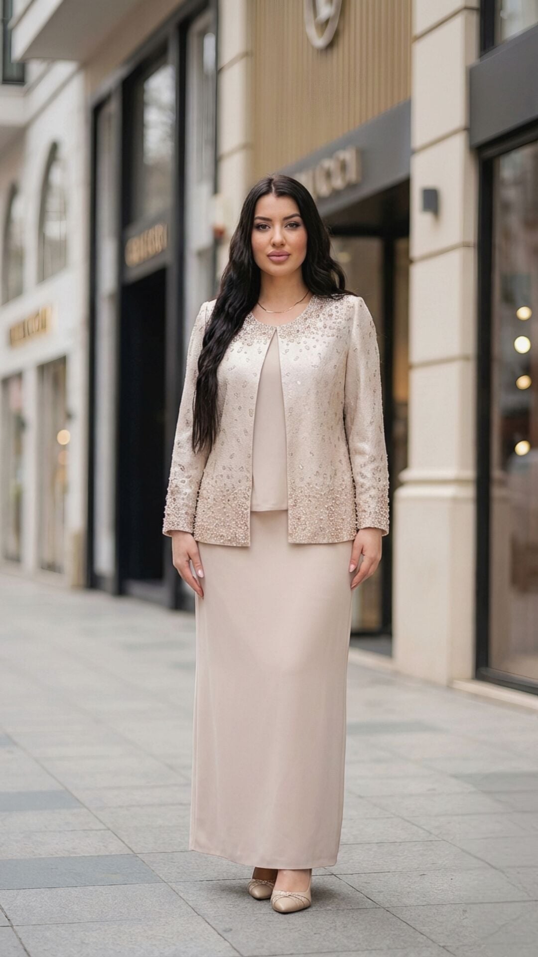 - İnci ve Taş İşlemeli Detaylar: Ceket üzerindeki zarif inci ve taş süslemeler tasarıma ışıltılı ve elegan bir hava katar.