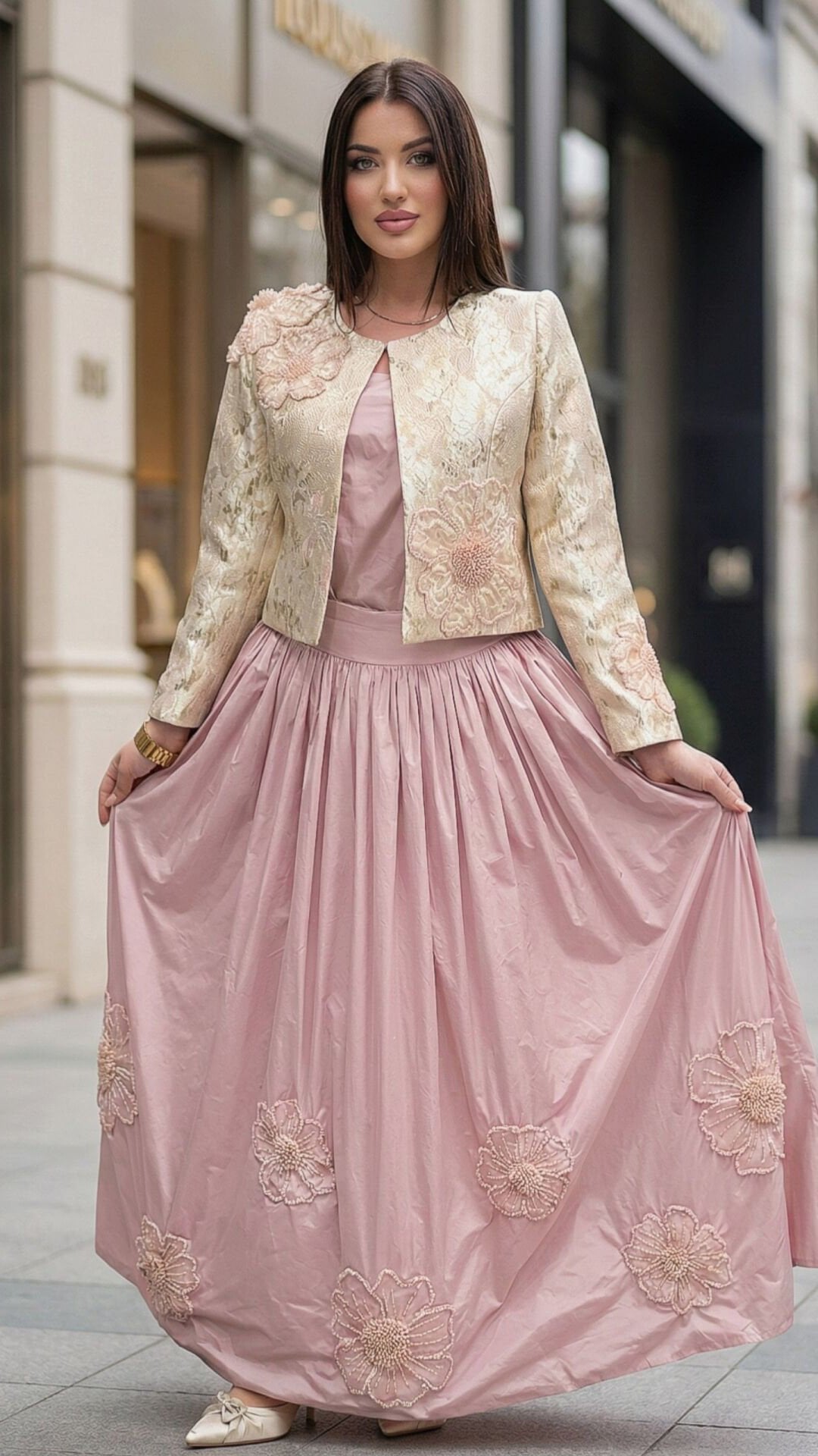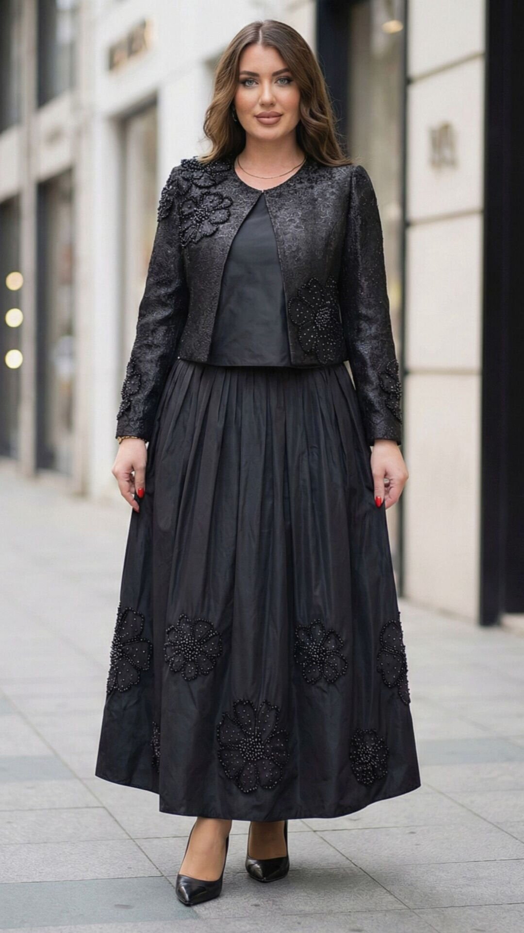 Doğaner Women Model 4305, jakar ceket ve tafta etek uyumunu boncuk işlemeleriyle harmanlayarak özel günlerinizde etkileyici bir stil sunar. Modern çizgiler ve zarif detaylarla tasarlanmış bu takım, her ortamda fark yaratacak bir parçadır.