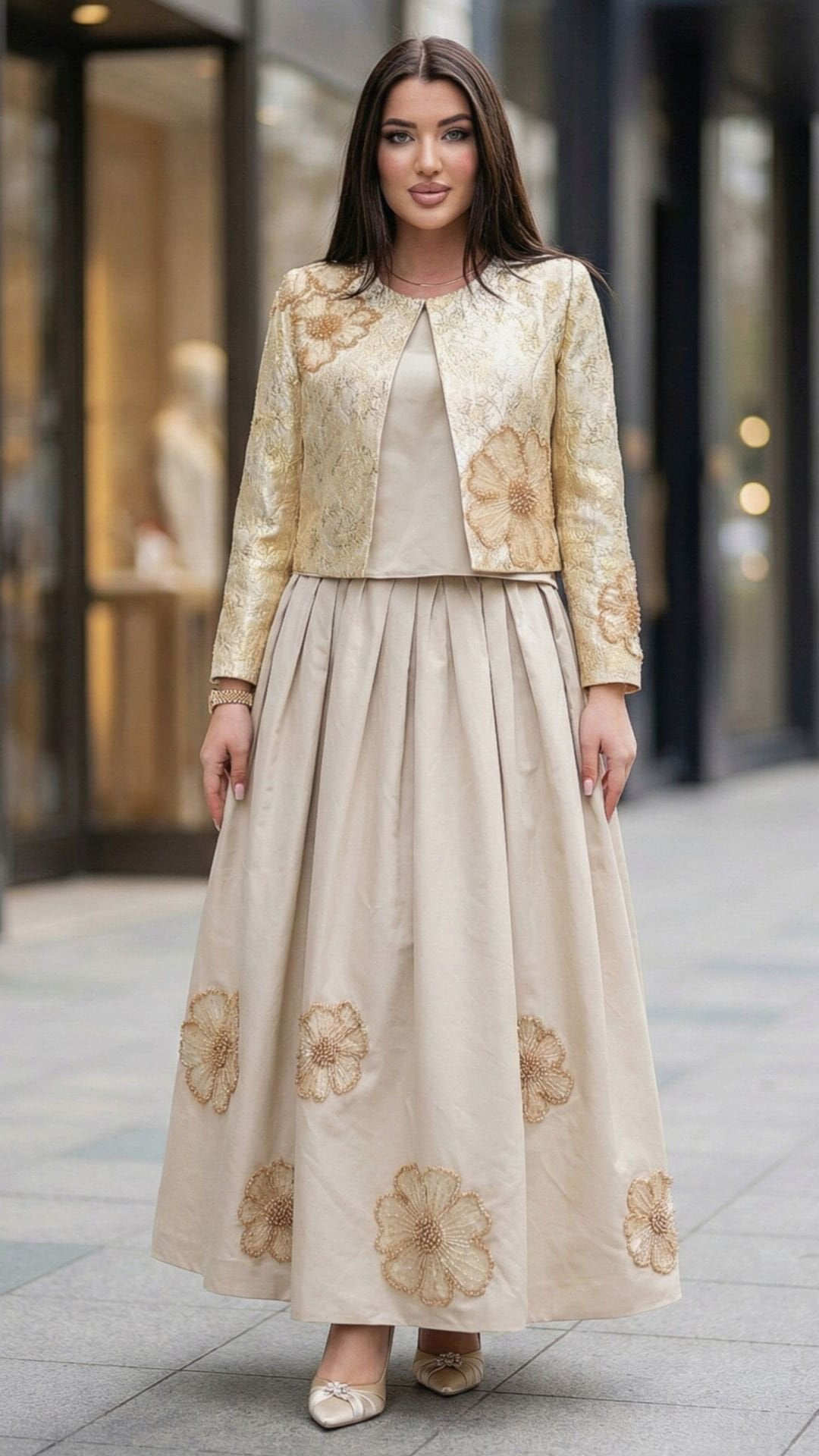 - Jakar Ceket Detayları: Kaliteli jakar kumaştan üretilmiş ceket, boncuk işleme süslemeleriyle sofistike bir görünüm sunar.