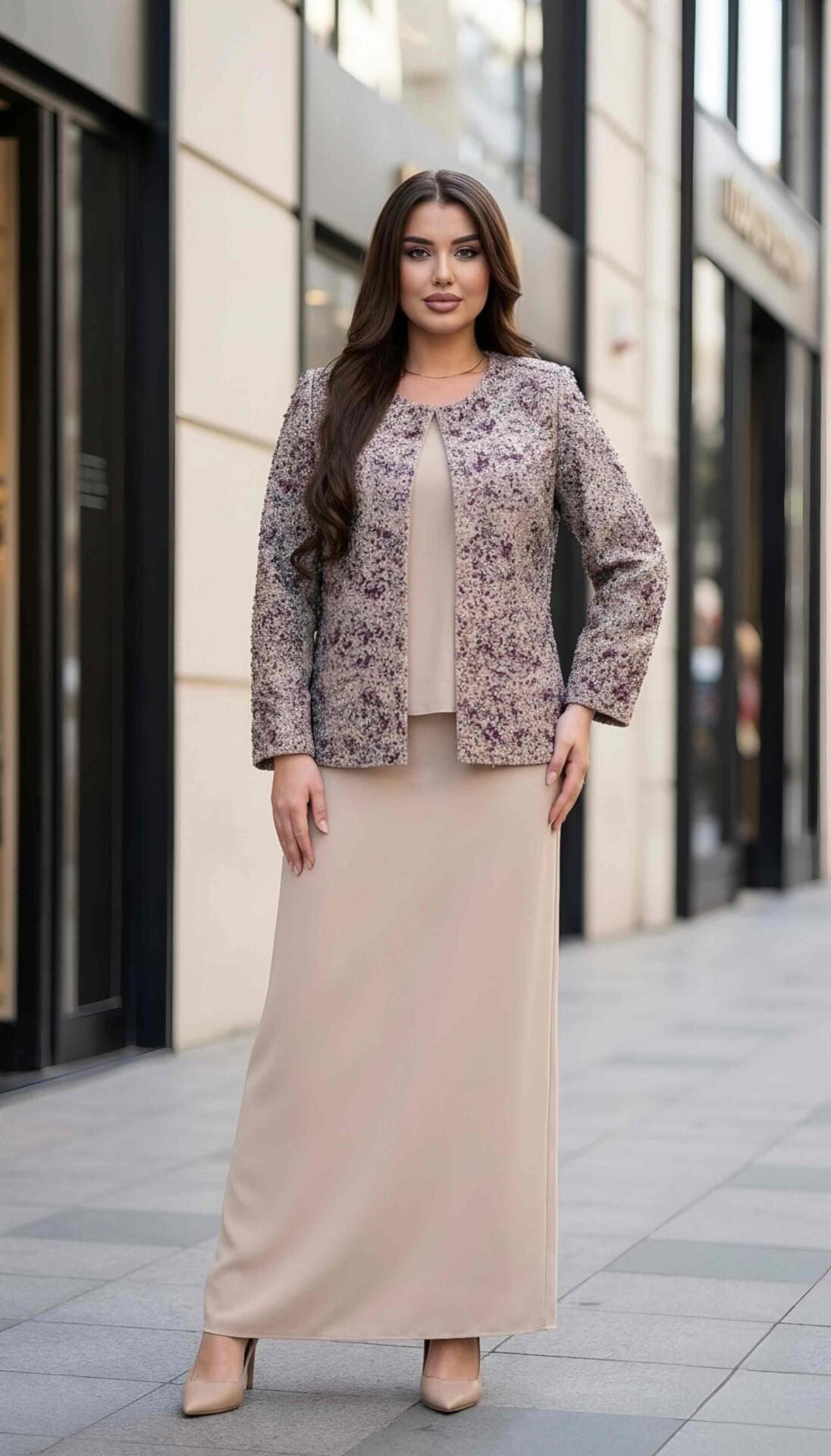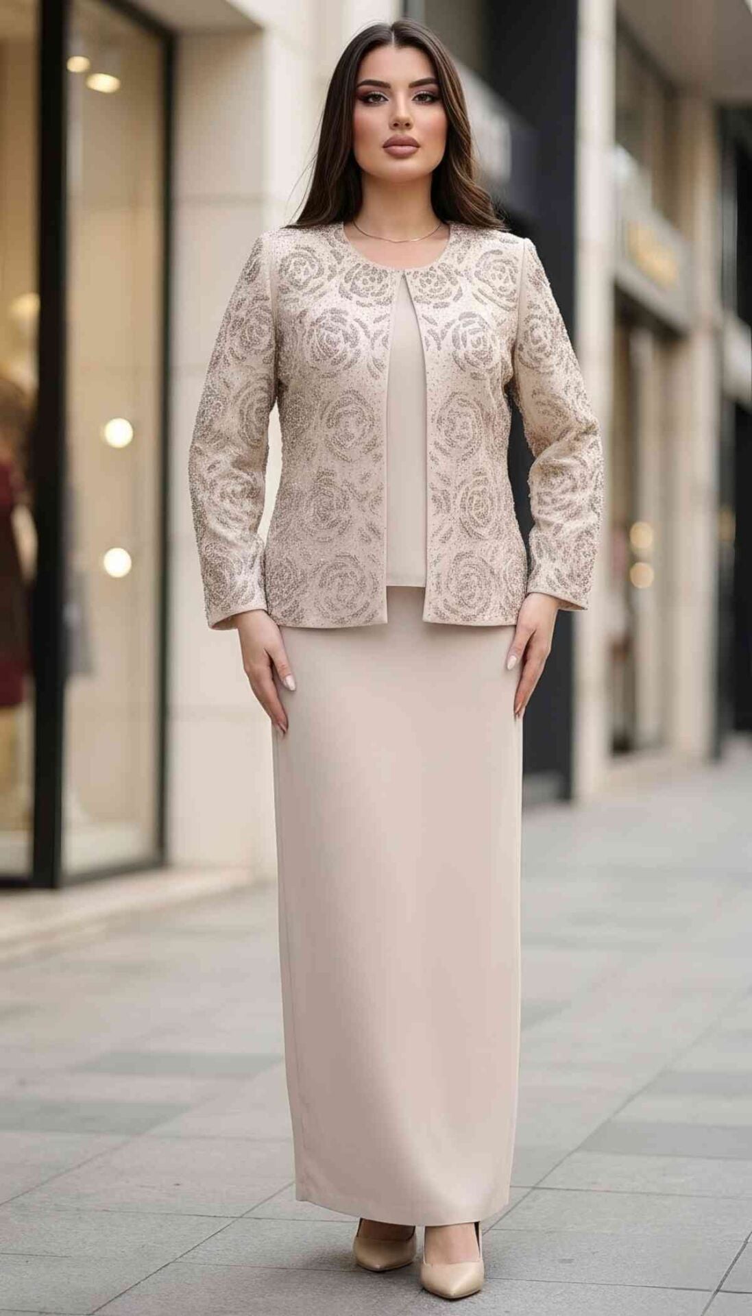 - Taş İşlemeli Detaylar: Ceket üzerindeki zarif taş süslemeleri takıma sofistike ve dikkat çekici bir stil kazandırır.