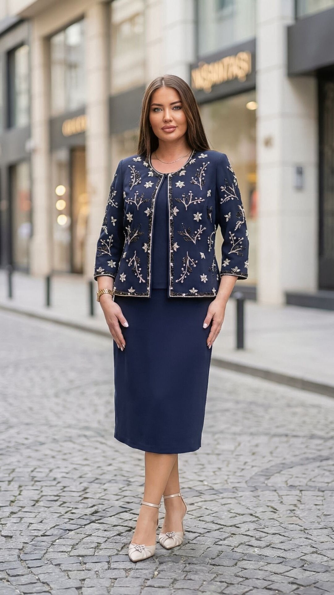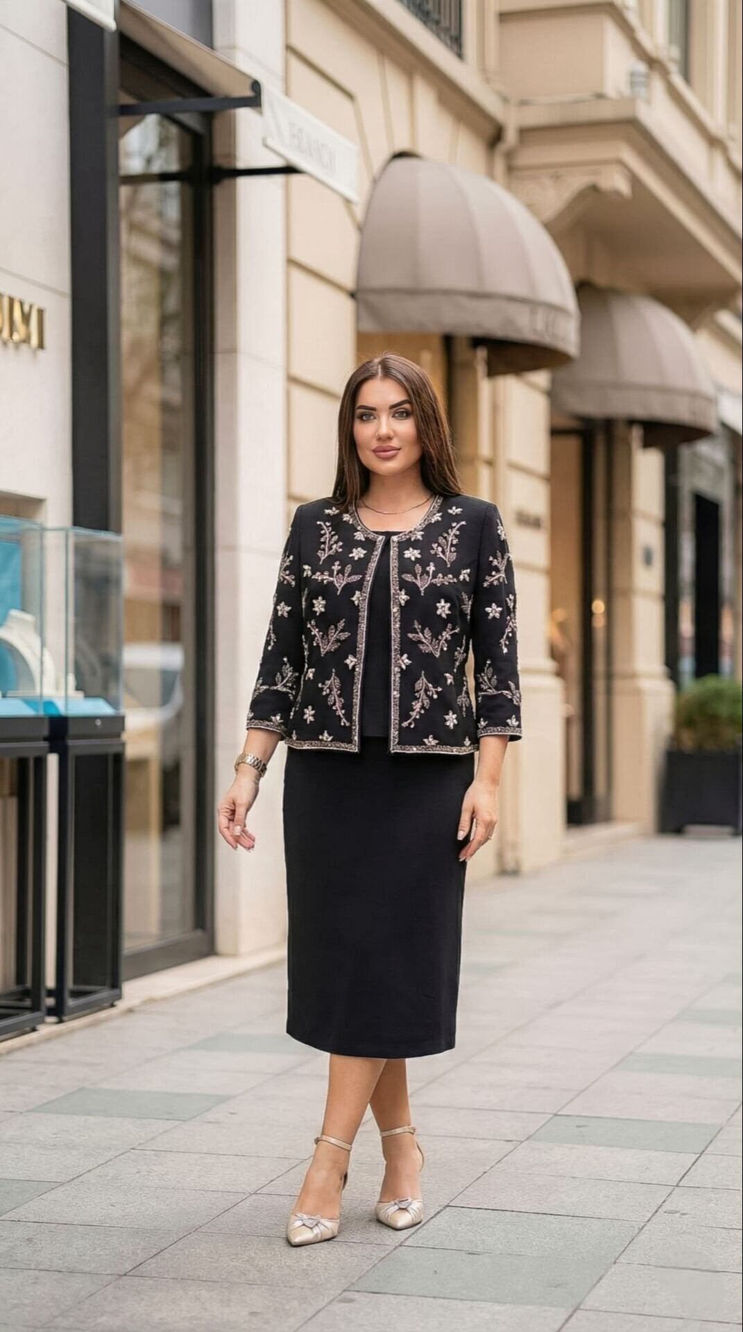 - Taş İşlemeli Detaylar: Ceket ve etek üzerinde özenle işlenmiş taş detaylar, sofistike bir görünüm sağlar.