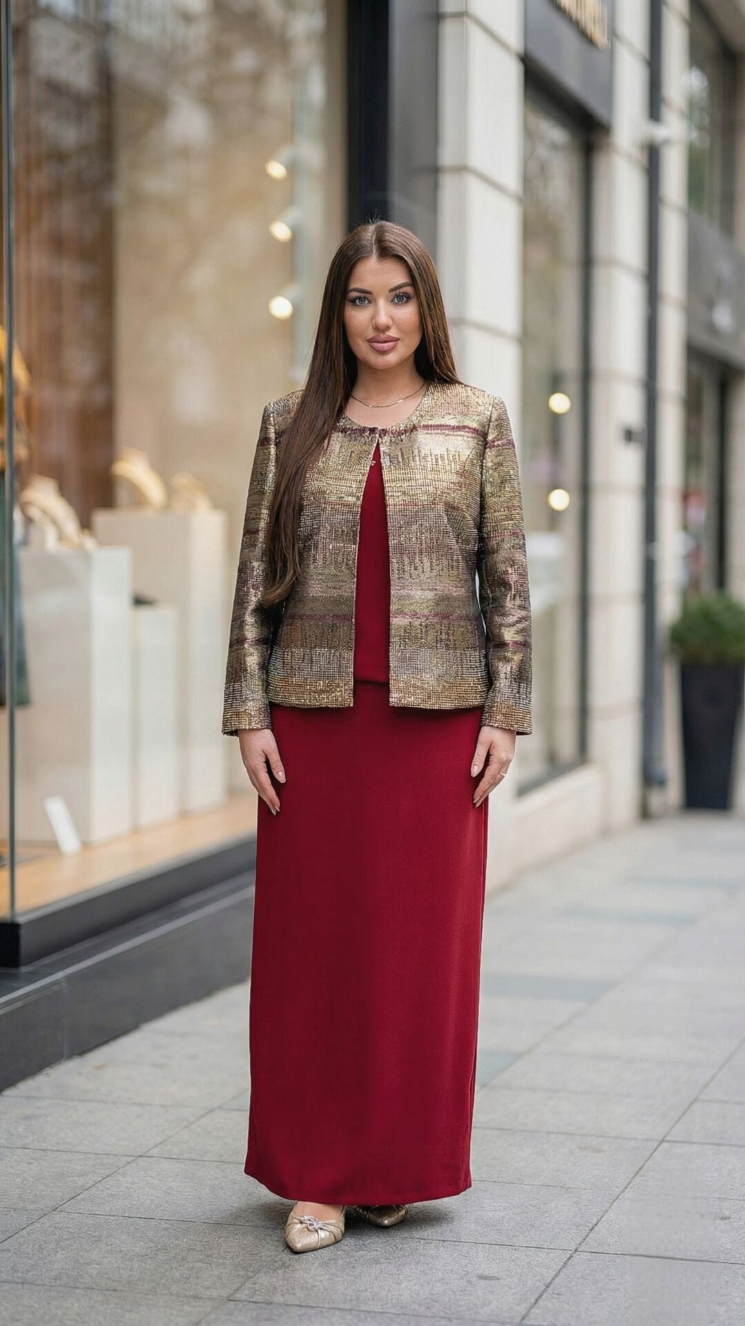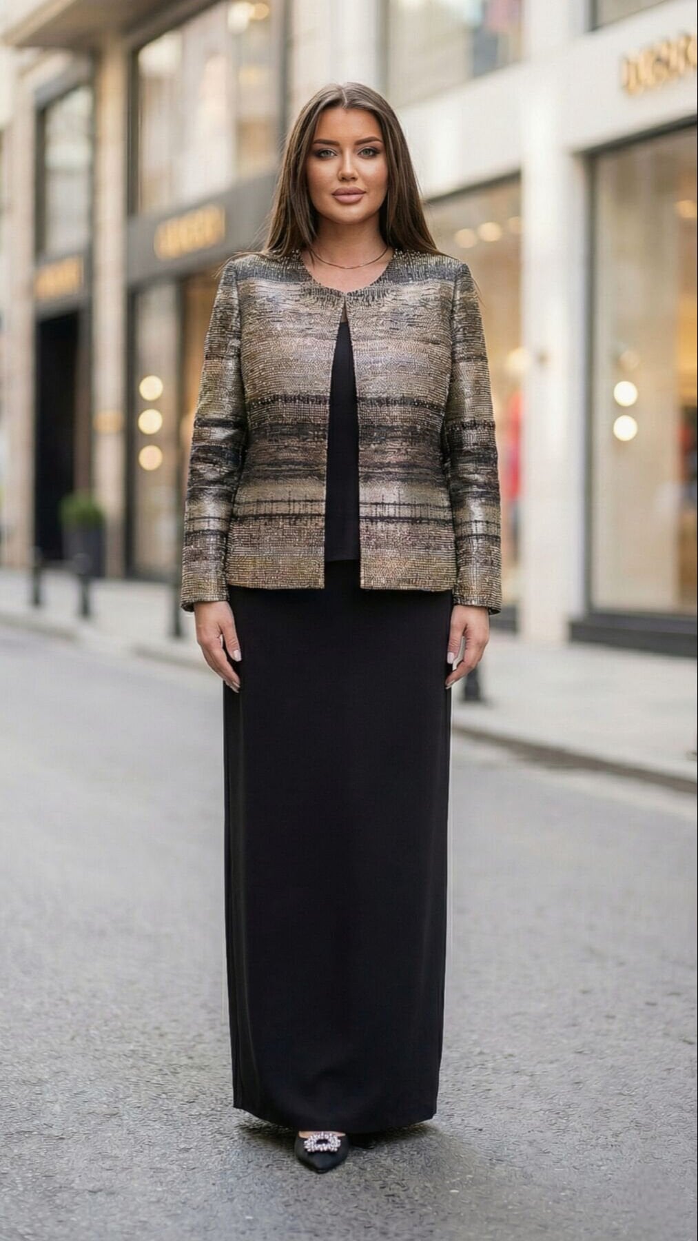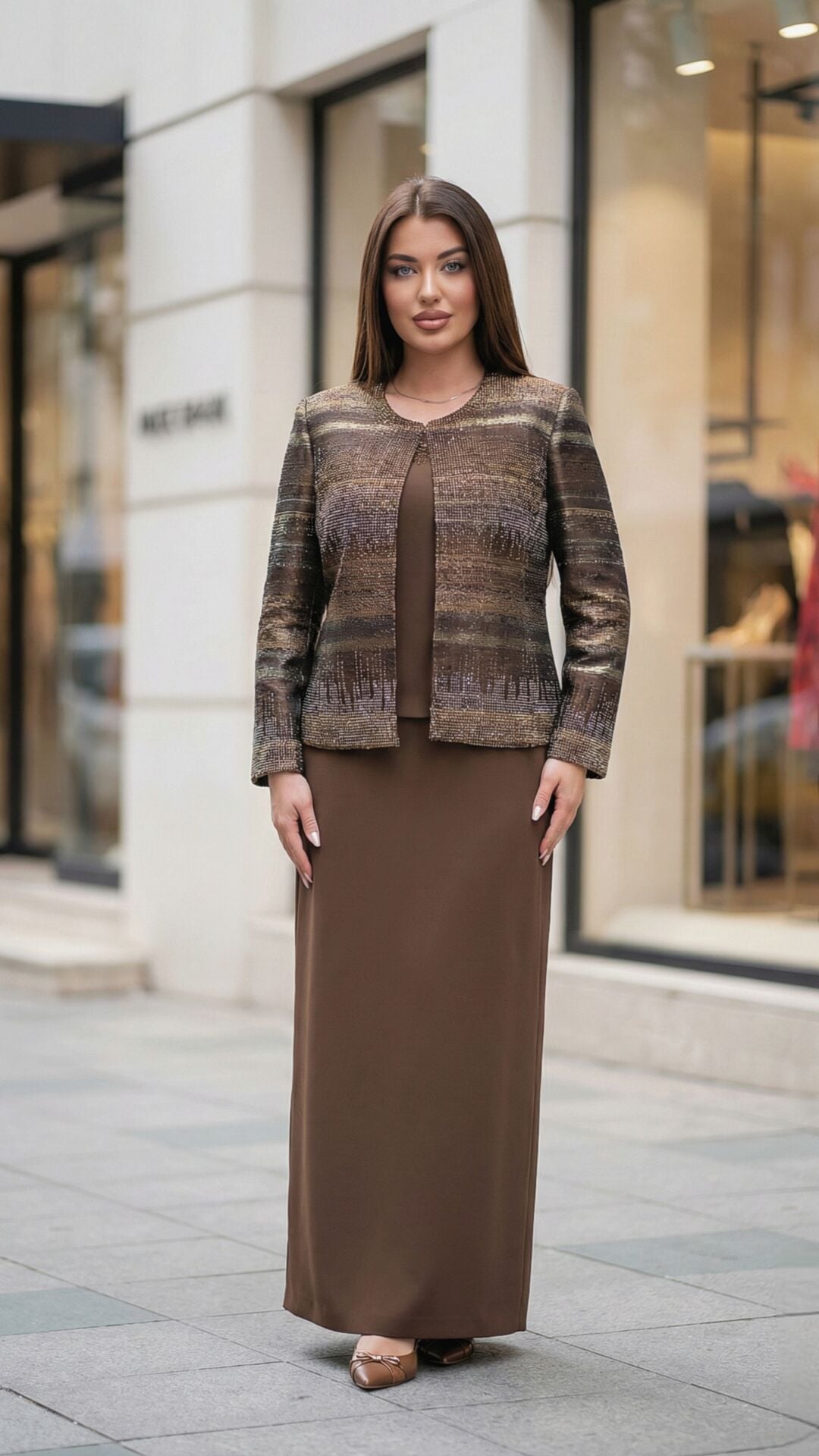 - Şık etek kesimi ve zarif ceket ile feminen bir siluet.