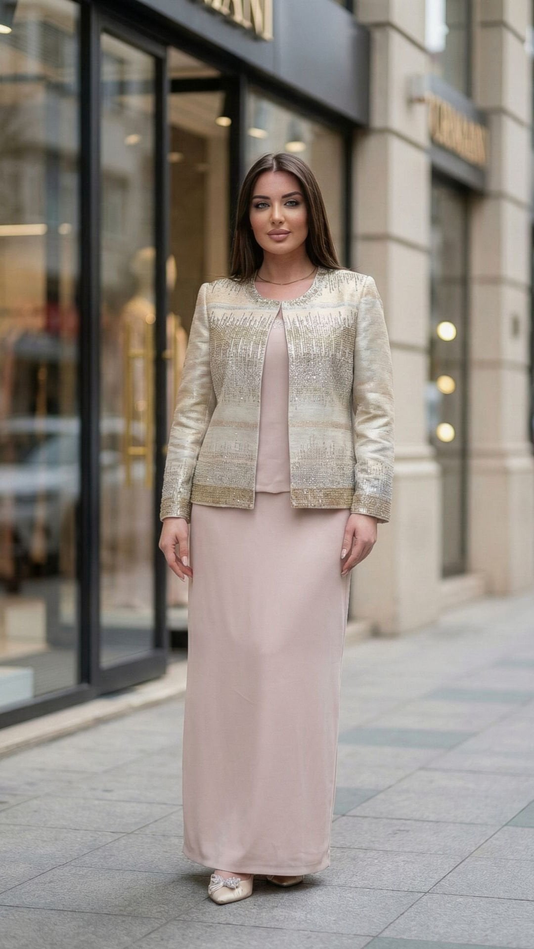 - Taş İşlemeli Detaylar: Ceket ve etekte özenle yerleştirilmiş taş işlemeler ile zarif bir stil.