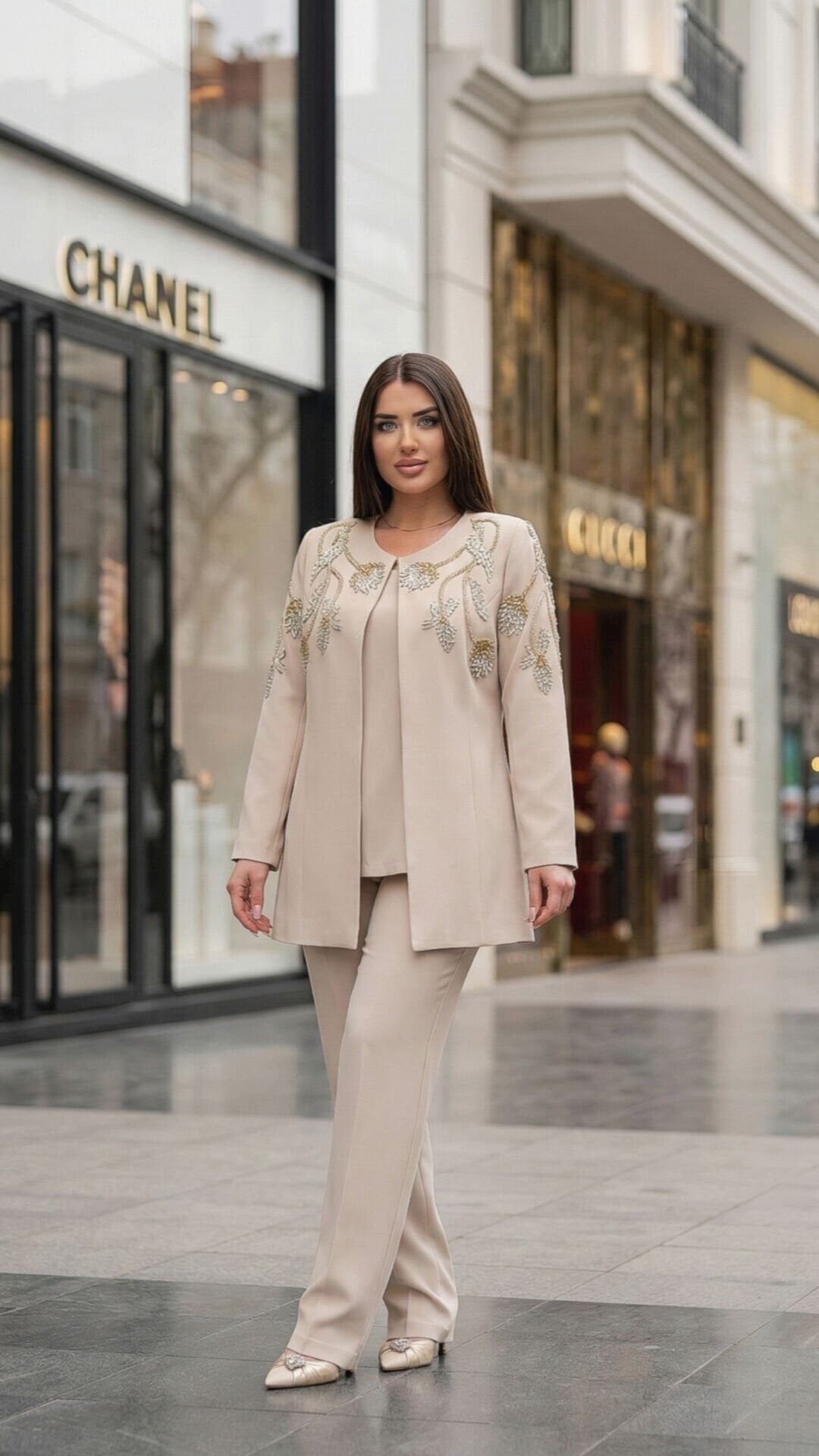 Taş işlemeli detaylar ve pantolon-ceket uyumu ile bu takım, modern ve zarif stil arayanlar için mükemmel bir seçimdir. Özel günlerde kendinizi özel hissetmenizi sağlayacak sofistike bir görünüm sunar.