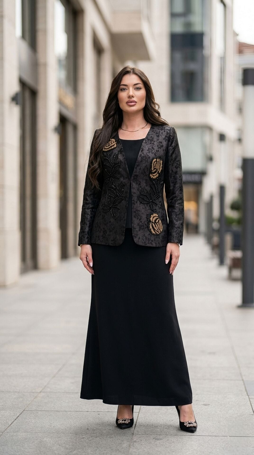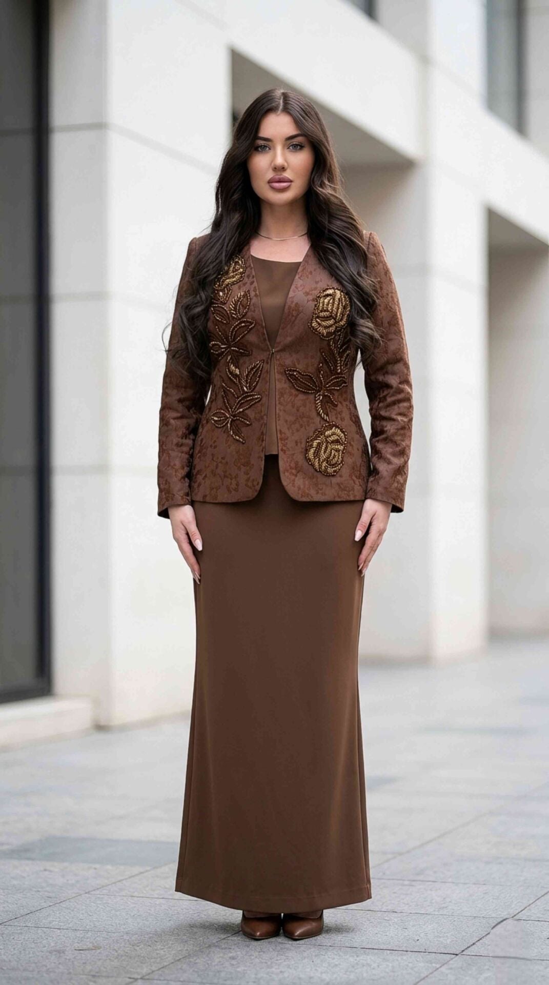 Doğaner Women jakar ceket, boncuk işlemeli, etekli kadın abiye takım elbise modeli 4445, özel günlerde zarif ve dikkat çekici bir görünüm oluşturmak isteyen kadınlar için tasarlanmıştır. Jakar kumaşın asil duruşunu boncuk işleme detaylarıyla tamamlayan bu model, etekli takım formu sayesinde düğün, nişan, söz ve özel davetlerde şık ve etkileyici bir stil sunar.